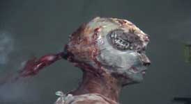 ![]() "Ready... aim... HAMBURGER!" Nevertheless, the group's arrival on the island is genuinely atmospheric. The first thing they encounter is an abandoned van, which immediately brings to mind the scene with the zombie child in Mattei's Hell of the Living Dead. Mattei reinforces the reference by having something nasty spill out the passenger side when the door is opened. In the rear of the van is a mobile communication unit, which Captain Jurgens decides to use as a base of operations (while his soldiers do the actual work). The sound of the rain pattering on the roof of the vehicle gives the scene a realistic feeling of loneliness; it might almost convince us we're not filming on a soundstage, until we realize that this "van" is more than half again as large on the inside as it is on the outside. ![]() "Ruh-rohhh... Rhaggy?" Captain Jurgens, Sharon and Barker watch from the van-mounted video monitors, while Sergeant Zamora leds his team into the research station. When one of his men finds spent shell casings on the ground, Zamora's keenly-honed military instincts tell him exactly what's happened: holding up a casing in front of the video camera, he tells Jurgens: "These were made by firearms!" Sharon, however, is more interested in something the monitor cameras have revealed on the ground behind them, something the soldiers themselves seem to have missed: severed limbs dripping with blood, and what appears to be a malformed fetus. "What in God's name went on here?" gasps Barker. "I don't know," replies Sharon, in her most serious tone; "but it doesn't... look... good." No; no, it doesn't. But at least the building isn't overrun with monsters, so it should be safe for Captain Jurgens to come in. If things didn't... look... good before, they look even worse when the team discovers an abandoned laboratory. Cannibal zombies seem positively wholesome compared to the things the Tyler Corporation scientists were up to. There are carved-up zombie corpses on slabs... more withered fetuses... and rows of dead women, in cages that would be inhumanely small for a medium-sized dog. The women were Tyler employees who were experimented upon: they seem to have been held prisoner and then forced, alien-style, to give birth of a new generation of monsters. Except, of course, it's not their chests that have burst out. And even though they're dead, at least one of them is still surprisingly mobile ("She didn't seem dead," shrugs Jurgens, after an attack). Shortly thereafter, the soldiers endure an attack by a zombie Little Person. Perhaps this is supposed to be one of the fetuses that didn't die immediately? In any case, it's very small, very angry, and it's got a wobbly eyeball growing out of the top of its head. By now we're starting to get the idea that these may not be ordinary zombies. They're... mutant zombies. But there's no time to worry about zombie taxonomy: the rescue team has been able to locate the survivors — or what they assume are the survivors — all huddled together in a single building at the far end of the research complex (they locate them by the identification chips that all Tyler emplyees have surgically implanted in them [!]). The computer (and the script of Aliens, if I remember correctly) identifies the building as the Generator Room, but Barker (who should know) refers to it as the "powder magazine". The powder magazine?! Well, now we know why the zombies were able to overwhelm the scientists: it's those damned muskets! Those muzzle-loaders take too long to reload. Obviously the rescue mission is going to be risky, so delicate, spun-sugar Captain Jurgens retreats to the safety of the communications van with Sharon and Barker. This leaves Zamora to do the dirty work, which turns out to be very dirty indeed: first, the team discovers a network of pipes leaking some viscous goo. Next, they find yet another bloody fetus lying on the ground. Finally, in a genuinely eerie moment that harks all the way back to the hanging dolls in Mattei's The Other Hell, they find a room full of corpses, all bagged in plastic and dangling from chains. To make matters even more delightfully revolting, the corpses have been dripping a little. Just beyond the room with the hanging bodies is another room, in which the bodies of four women lie rotting on tables. Three of the woman look as if their abdomens had exploded — apparently they've found some of the sources of the fetuses that litter the complex. However, the abdomen of one of the women is covered in a sheet, and it looks as though she died still pregnant. When one of the soldiers goes to investigate the unmutilated body, the woman opens her eyes: she may be partially zombified, but the remaining human part of her begs her "rescuers" to kill her. And then, in apparent homage to Mattei's and Lucio Fulci's Zombi 3, the monster baby claws its way out of its mother's womb... while in the background, the eviscerated women sit up on their slabs. I feel there's something I need to clarify: although Zombies: The Beginning has all the hallmarks of a classic Bruno Mattei film, and refers to several of his movies explicitly, this is one of the few films of Mattei's late career for which he did not receive writing credit. The credited scriptwriters for the movie are Paolucci and Andrea Tentori — if you look up Tentori's writing credits on the IMDb, you'll see he worked with Fulci on Cat in the Brain, so clearly he has some experience with films that "reference" other films (in the sense that Bonnie and Clyde were "bank referencers"). If it's true that Mattei was only minimally involved with the script, then it's amazing that anyone else was able to come up with something so faithful to the spirit of the old man's work3. In fact, you can't help but wonder if everything — the "borrowings" from other films, the inane English dialogue that's just a little out of kilter, the painful comic relief, the plot twists that either go nowhere or else completely de