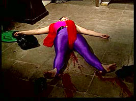 (Pay special attention to the strategically-placed scarf. Also, pay special attention to the strategically-placed blood splash in the center of the screen shot. Are you starting to figure out why I hate this movie as much as I do?) The janitor takes a few tentative steps toward the girl, then drops his bucket and mop (on top of Hesti) and runs upstairs to fetch the dancers. Everybody crowds into the doorway to gawp at poor Hesti's body. The dance instructor sends a handful of his students out to get the police. Still standing in the doorway, the instructor gives his considered opinion: Hesti has been a victim of rape. Her full-body leotard is apparently undisturbed, and there seems to be more blood around the soles of her feet than anywhere else... but rape is the conclusion he comes to. Everybody looks at the bucket and mop, then at the janitor; then back to the bucket and mop; then back to the janitor. Slowly, the poor old man begins to realize what everybody's thinking. "Ti... ti... ti... TIDAK! (N- n- n- NOOO!)" he cries, and runs away. The instructor and the male dancers all run after him, while the female dancers remain in the doorway biting their fingertips. Only the orange-clad Narrator takes the initiative and actually walks into the room; but instead of going to Hesti's side, she goes straight to the garbage bin to see if the sanitary napkin is there. Priorities! An ambulance takes Hesti's body to the local hospital. The middle-aged man from the motel watches them arrive: his shirt is undone, his tie is off, and he wears an expression of utter misery, but he doesn't attempt to get in to see her. In fact, he doesn't even interact with the attendants: he just stands on the sidelines and shakes his head. In the meantime, Hesti is brought into the hospital. Her eyes stare sightlessly at the ceiling as the medical team shifts her to a table, where they fit her with an oxygen tube and... ... and... An oxygen tube? You mean, she's still alive?! Everybody just wasted all that time standing in the doorway, watching her bleed all over the bathroom floor, and SHE WAS STILL ALIVE??! (OK: NOW have you started to figure out why I hate this movie so much?) As Hesti lies dying, she goes into a flashback. We see a familiar blue car pull up on a country road, and out step Hesti and the middle-aged man. They're wearing the same outfits they wore when we first saw them in the prologue: the man is in his shirtsleeves, and Hesti is in her heavy purple "femme fatale" outfit (though now we can see that the dress doesn't really fit: it's too tight to zip all the way up the back). The man takes her hand; she looks away shyly, and they begin their idyllic walk though the country farmland. Occasionally we cut back to Hesti lying on the hospital table, boggling like a pop-eyed goldfish, while the nurses do what little they can. And then we see a funeral procession. Apparently, in spite of the <sneer>prompt action by her friends</sneer>, Hesti didn't make it. Watching the funeral from a safe distance, his legs worn bloody from his flight, is the old janitor accused of attacking her. After the funeral, the male mourners gather at Hesti's family's house to chant the traditional creed, La ilaha ilallah ("There is no God but Allah"); while the women wait in other parts of the house, praying silently, cooking and cleaning. One of the female mourners goes into the bathroom... only to find... ![]() Bloody Hell! Literally! ... the Maxi-pad Monster splashing in a tubful of blood! It's followed its victim's family home (I know women sometime refer to their periods as "The Curse", but I had no idea they meant it literally)! The girl screams and falls to the floor in a faint. When Hesti's father and our Narrator reach the bathroom, there's no sign of any disturbance. But the Narrator has her suspicions. And she's going to tell them to us, right now... We find ourselves in a misty black room, where our orange-clad heroine stands waiting in silence. What's she waiting for? For the clapper-loader, of course... which tells her to start the scene nearly 15 seconds after the camera has begun rolling. "It's all true," she says. "I was drawn into these mysterious events. Let's go together and see!" She exits the smoky room, and re-emerges in the Ladies' Restroom where Hesti met her fate. Although we've been led to believe it's been a couple of days since the tragedy, there are still blood smears on the floor — more blood, in fact, than we remember seeing earlier, and in different locations. It looks as though something's left fresh blood tracks... leading to the waste basket, which is now empty. The Narrator then destroys the flow of the story by turning back to the camera and speaking her thoughts directly to us. This means the Narrator is now addressing the audience from two separate points in time, which doesn't make a lot of sense: she started telling us her conclusions outside the story proper, but she finished her statements from within it. In any case, she begins a lengthy explanation that my Indonesian dictionary and I found much too difficult to decipher. It seems to be something to the effect that even though there may not be any evidence, Hesti must have been assaulted by some sort of spirit. I think she starts to get worked up about the influence of demons on poor, weak, sex-obsessed mortals like ourselves... when suddenly, the menstrual-blood-eating monster starts to materialize behind her. She turns around and glares at the creature, which slowly fades away. Next, we're back to a familiar spot the country, as the middle-aged man (whose name and identity we still don't know) drives up to the same spot he visited in Hesti's flashback. This time, he's not driving his rattletrap blue Ford: he's driving something even less likely: