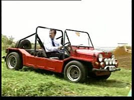 The man gets out of his souped-up golf cart just in time to meet another 60's-vintage car approaching from the opposite direction. Out of the second car steps an officious-looking woman carrying a manila envelope. She walks up to the man and begins an earnest conversation. Aha! we think. At last we're going to get some explanation of who this guy is, and what relationship he had with Hesti. Maybe the film's whole raison d'être is about to be made clear to us. The woman launches into her speech — at least, that's what she appears to be doing; we see her lips start moving, but we can't hear a word she's saying. It's not just that the ludicrously happy music on the soundtrack is drowning her out: the whole sequence has been shot without sound. We're not supposed to understand what these two are saying to each other! The sequence tells us nothing, and even adds an extra character whose presence we're at a loss to explain. The only thing we know for certain is that the conversation was about Hesti, and we know this because as soon as the woman walks away, the man grimaces, rubs his forehead, and... ...his companion is no longer in bed with him — wrapped in a sheet, Hesti stands at the open door of the motel room. As the man watches her, she turns her head slowly, and casts a languid glance at the blood-red moon... Suddenly, the Narrator wakes up with a start. At first she doesn't seem to realize where she is, but then she recognizes her own bedroom. She sits up in the bed, a frightened expression on her face (meet the new footage: same as the old footage). She's been dreaming about a globbering red demon in the Ladies' Room where Hesti was attacked. Uneasily, she gets out of bed to reassure herself the house is secure. She goes to the window and pulls back the shade... only to find (BUM BUM BUMMM!) an underlit face staring up at her! False scare: it's just the fugitive janitor. He's realized that whatever killed Hesti is probably now on the Narrator's trail, and he's come with a special magical talisman that should banish the demon back to hell. How he's discovered there's a demon, how he's figured out what's going to happen, and how he became a mystic I don't know, and by this time I really don't care. He hands our Narrator something that looks like a pepper on a stick, under which something that looks like two cloves of garlic has been suspended. Frankly, this talisman looks a lot like something else, which I will let you figure out on your own:
