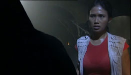 Our crew of would-be treasure hunters is heading back to port that night when they are suddenly overtaken by a mysterious fog bank. The most mysterious thing about this fog bank is its ability to spring up in the middle of a torrential downpour. Anyway, confronted with this fog bank, that old sea-dog Captain Kirk decides the only thing to do is for everybody to give up and go to sleep. They'll decide what to do in the morning, when the weather clears (assuming the boat is still afloat at that point). Makes perfect sense to them: that's that! In the morning — Fred being awakened in typically-classy Mattei style, by a seagull taking a dump on his face — the crew finds they've drifted to an uncharted island. An enormous, mountainous uncharted island, with what looks like a fairly large city visible in the distance in a couple of shots... an uncharted island that, if you look closely, seems to be frequented by lots of other watercraft... but an uncharted island nonetheless. ![]() The city is much clearer on a large screen. ![]() ![]() Kirk suggests they all go ashore and explore the island, while Max stays behind and repairs the boat from the previous night's storm damage. While Max descends into the bowels of the ship, grumbling, the others grab firearms and (apparently) an inexhaustible supply of ammunition and take the lifeboat to the island. Once ashore, the crew splits into two groups. Kirk, Victoria, Fred and Snoopy go off and discover the burnt-out remains of the Spanish colony (the old ruined buildings are genuinely atmospheric: you almost have to think that Mattei and Paolucci found the site somewhere in the Philippines, and realized they needed to make a horror movie there. But what sort of horror movie? A zombie flick? A vampire film? A ghost story? Ahh, the hell with it: let's make all three at once!) As they enter the ruins, a rotting shape in Spanish armor appears in the foreground, looking after them... slowly it turns and snarls at the camera. Meanwhile Tao, Mark and Sharon go off in the opposite direction, looking for water. They find what appears to be a fresh-water lake, and Tao goes off to fill their containers. But Mark and Sharon find themselves in an old Spanish graveyard, with 17th century inscriptions on the headstones (chances are you're thinking of Zombie 2 at this point, but the truth is far worse). Sharon comes across the tombstone of a little boy, and decides to look for flowers to place on his grave. Mark thinks she's being ridiculous, and starts to make fun of her. Now... if you're watching this with a large group of people (and you really should, by the way), this is the point at which some wag, remembering the original Night of the Living Dead, will pipe up, "They're coming to get you, Barbara!" The one who does this will be the person least familiar with Bruno Mattei. Keep your eyes on this person, and watch his or her expression as the scene goes on. This is the point in the movie at which less-experienced audience members start to lose their shit. For Mark does go into the whole NotLD "They're coming to get you!" shtick. At the opposite end of the (suddenly) fog-strewn graveyard, a single shambling figure appears. This scene reminded me of the early 1980's, when the practice of colorizing old black-and-white films was causing controversy. One of the first movies that got colorized, using the then-state of the art Crayola method, was Night of the Living Dead. Critics pointed out that Bill Hinzman's zombie in the opening graveyard scene had been tinted green. This made it obvious from the outset that there was something wrong with him, and completely ruined the point of Johnny's taunts. Why on earth would Barbara go up and apologize to a guy who was bright green, for crying out loud? Those critics would have a field day with Mattei's version of the scene. For the figure that appears at the far side of the cemetery is not only grey and rotten-looking... is not only staggering like a drunk... is not only clothed in bloodstained rags, and covered with great festering wounds. No. His nose has rotted off! And as if all that wasn't enough of a giveaway, when he ends up about a foot and a half away from Sharon and Mark, he stops short and begins roaring at them. A torrent of blood oozes out of his mouth. And that's the point at which Sharon figures out that something's not quite right. ![]() Of course, by this time it's far too late; and Sharon would be zombie chow, were it not for the sudden arrival of Tao. Up 'til now, the chubby and slightly effeminate Tao's been looking like he'd be the comic relief... but all of a sudden he breaks out the martial arts skills, and starts wailing on the walking cadaver. I could be mistaken, but isn't this scene taken from early in Claudio Fragasso's Zombie 4? Mattei put up some of the money for Fragasso's film, but was otherwise uninvolved in it; there's actually something touching about the thought of Mattei throwing in a reference to his estranged colleague. Nothing bridges the years quite like out-and-out theft, right? Anyway, like the similar moment in Zombie 4, the fight doesn't go quite the way Tao planned. Zombies don't respond to injury the way living opponents do, and they don't fight fair. "What are you waiting for?" cries Tao to the others... and Sharon and Mark, understanding him to mean "get away" rather than "come help me before I get killed", high-tail it. With Tao's dying screams echoing in their ears, Sharon and Mark pause for the following Immortal Dialog: SHARON: It's Tao! He sacrificed himself for us! We've got to go back... Mind you, things haven't been going especially easily for the Captain and the others, either. After some embarrassing misadventures, they find themselves in a torture chamber filled with skeletons. There are wooden stakes in several of the skeletons, though not where you'd expect them... they're jammed on top of collarbones, for example, or sticking out of their mouths. Piled among t