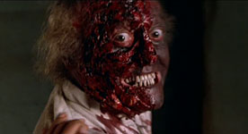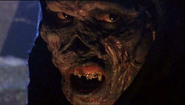 But the real surprise — something I thought even Bruno Mattei wouldn't stoop to — was this: he steals from Bruno Mattei. Specifically, he lifts things from his own Hell of the Living Dead. There's a scene in which Sharon finds a hooded figure kneeling by the mysterious altar. She slowly approaches the figure, whispering, "Father? Father?" She puts her hand on the robed figure's shoulder, and the priest turns around slowly. And he's a rotting zombie! Aaargh! |